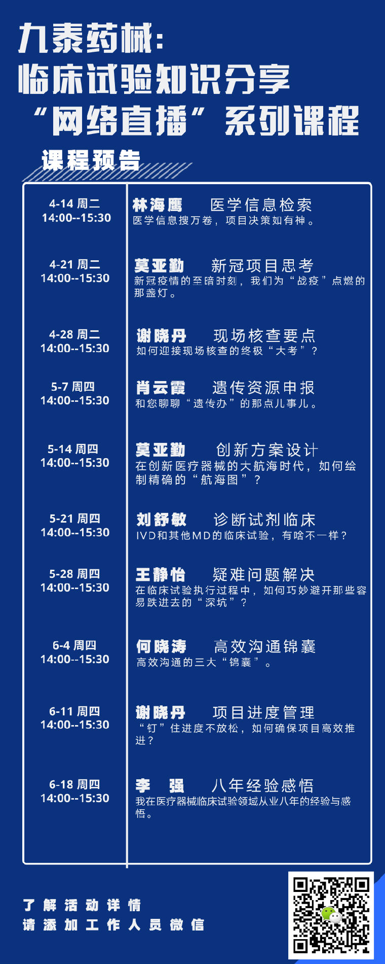 ÎÒÃǼƻ®°ÑÄÚ²¿Åàѵ¿Î³Ì£¬·ÖÏí¸øÁÐλÉê°ì·½ÅóÓÑ£¬ÍƳö¹²¼Æ10ÆÚµÄÁÙ´²ÊÔÑé֪ʶ·ÖÏí¡°ÍøÂçÖ±²¥¡±ÏµÁпγ̡£ÎÒÃǽ«´ÓÁÙ´²ÊÔÑéµÄ¸÷¸öÖØÒªÎ¬¶È£¬ÏòÁÐλÉê°ì·½ÅóÓѽøÐÐÉîÈëÆÊÎö£¬´ÓҽѧÐÅÏ¢¼ìË÷¡¢µ½ÒÅ´«×ÊÔ´É걨£»´ÓÁ¢ÒìÁÙ´²¼Æ»®µ½Ð¹ÚÏîĿ˼¿¼£»´ÓÕï¶ÏÊÔ¼ÁÁÙ´²µ½¸ßЧÏàͬ½õÄÒ£»´ÓÏîÄ¿½ø¶ÈÖÎÀíµ½ÒÉÄÑÎÊÌâ½â¾ö£»´ÓÏÖ³¡ºË²éÒªµãµ½¡°ÀÏ衱µÄ°ËÄêÐÐÒµ¾Ñé·ÖÏí£¬ÎÒÃÇÖÂÁ¦ÓÚ³ÉΪÄú×öÁÙ´²¾ö²ßµÄ¡°ÕÕÁϹ١±£¬ÏîÄ¿ÔËÓªµÄ¡°Ö´Ðй١±¡£