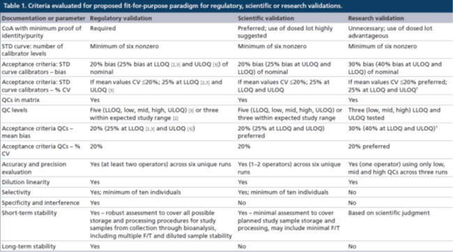 ¿ÆÑ§¼¶ÑéÖ¤£ºÔÚ½øÐÐÑо¿Ç°¿ÆÑ§¼¶ÑéÖ¤µÄÀú³ÌÖУ¬STDÇúÏ߯À¹ÀÒÔ¼°×¼È·¶ÈºÍ¾«ÃÜ¶ÈÆÀ¹À¿ÉÒÔÓÉÒ»Ãû»òÁ½ÃûÆÊÎöʦÔÚ2ÌìÄÚÍê³É£¬¿ÉÓÃÀ´¼õÉÙÑо¿Ç°½×¶ÎµÄÁ¬ÐøÊ±¼ä¡£ÕâÓë¼à¹Ü¼¶ÑéÖ¤ËùÐèÒªµÄ¸üÎȽ¡ÆÀ¹ÀÏà·´£¬¿ÉÊÇÊÇ¿ÉÒÔ½ÓÊܵģ¬ÒòΪËü·´Ó¦Á˸ÃÒªÁìÖ»ÊÇ¶ÌÆÚµØÓ¦ÓÃÓÚÑùÌìÖ°Îö¡£¿ÆÑ§¼¶ÑéÖ¤µÄÑо¿Ç°ÑéÖ¤ºÍÑо¿ÖÐÑùÌìÖ°ÎöµÄÄ¿±ê½ÓÊܱê×¼Óë¼à¹Ü¼¶ÑéÖ¤µÄÄ¿±ê½ÓÊܱê×¼Ò»Ö£¬µ«»ùÓÚÊý¾ÝµÄÔ¤ÆÚÓÃ;µÈ¿ÆÑ§ÔÒò£¬¿ÉÄÜ»áÓ¦Óøü¿í·ºµÄ½ÓÊܱê×¼£¨ÀýÈç>20%Æ«²îºÍ %CV >20%£©¡£ÔÚºóÐøµÄ"ÌÖÂÛ"Õ½ÚÖУ¬ËùÓеĽÓÊܱê×¼¶¼ÌåÏÖÄ¿±ê/Ô¤ÆÚ½ÓÊܱê×¼¡£