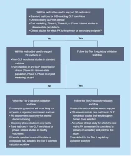 ±ðµÄ£¬µ±PK½«×÷ΪGLP·ÇÁÙ´²»òÁÙ´²Ñо¿µÄÒ»²¿·Ö£¬ÔÚÏ¡ÓеÄÉúÎï»ùÖÊ£¨ÀýÈ磬¾«Òº¡¢ÊàŦǻ»¬Òº¡¢ÓÕµ¼Ìµ¡¢¿ÚÇ»ÄÚÊÃÖ½¡¢×éÖ¯¾ùÖÊ¡¢Ö§Æø¹Ü·ÎÅݹàÏ´[BAL]Òº¡¢ÄòÒºµÈ£©ÖнøÐÐÆÀ¹Àʱ£¬¿ÉÒÔʹÓÿÆÑ§¼¶ÑéÖ¤µÄÆÊÎöÒªÁ죨µÚ2¼¶£¬Tier 2£©£¬ÈçFDAÖ¸Äϲݰ¸ÖÐ˵Ã÷µÄ£¬±¾Ö¸ÄÏ¿ÉÄÜÊÊÓÃÓÚѪҺºÍÄòÒºµÄBA¡¢BEºÍPKÑо¿¡£¹ØÓÚÓÃÓÚÄÚ²¿¾ö²ß£¨ÀýÈç̽Ë÷ÐÔÑо¿¡¢ºòѡҩÎïµÄÑ¡Ôñ¡¢Åä·½±È½Ï»ò¶ÔÒ©Àí»úÖÆµÄÑо¿£©»ò×÷Ϊ·ÇGLP »òÒ©Îï·¢Ã÷Ñо¿ÖÐʹÓÃÁËÏ¡ÓлùÖʵÄPKÆÀ¹À£¬¿ÉÒÔÓ¦ÓÃÑо¿¼¶ÑéÖ¤ÊÂÇéÁ÷£¨µÚ3¼¶£¬Tier 3£©¡£Í¼1¸ÅÊöÁËÔÚÒ©Î↑·¢µÄ¸÷¸ö½×¶Î£¬¿ÉÒÔÓ¦ÓÃÓÚ¸÷¸ö½×¶ÎµÄÏàÓ¦¼¶±ðµÄÒªÁìÑéÖ¤Á÷³Ì¡£