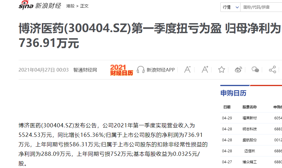1066VIPÍþÄá˹ҽҩ£¨300404£©Ðû²¼2020Äê¶È±¨¸æºÍ2021ÄêµÚÒ»¼¾¶È±¨¸æ¡£Êý¾ÝÏÔʾ£¬¹«Ë¾2020ÄêʵÏÖÓªÒµ×ÜÊÕÈë2.6ÒÚÔª£¬½ÏÉÏÄêͬÆÚÔö³¤16.25%£»¹éÊôÓÚÉÏÊй«Ë¾¹É¶«µÄ¾»ÀûÈó1698.86ÍòÔª£¬½ÏÉÏÄêͬÆÚÔö³¤157.69%£»±¨¸æÆÚÄÚ¹«Ë¾ÐÂÔöÒµÎñÌõÔ¼½ð¶îÔ¼5.5ÒÚÔª£¬½ÏÉÏÄêͬÆÚÔö³¤Ô¼15%¡£2021ÄêµÚÒ»¼¾¶È£¬ÊµÏÖÓªÒµ×ÜÊÕÈë5524.53ÍòÔª£¬Í¬±ÈÔö³¤165.36%£»¹éÊôÓÚÉÏÊй«Ë¾¹É¶«µÄ¾»ÀûÈó736.92ÍòÔª£¬Í¬±ÈÔö³¤225.69%£»ÐÂÔöÌõÔ¼½ð¶îÔ¼1ÒÚÔª£¬Í¬±ÈÔö³¤Ô¼146%¡£