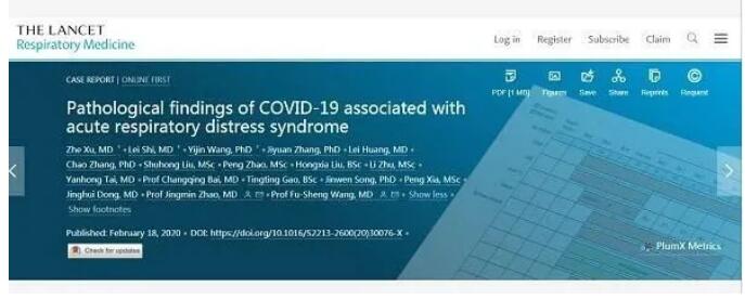 5.Xu Z, Shi L, Wang Y, et al. Pathological findings of COVID-19 associated with acute respiratory distress syndrome. The Lancet Respiratory Medicine 2020; published online Feb 17. DOI:10.1016/S2213-2600(20)30076-X.