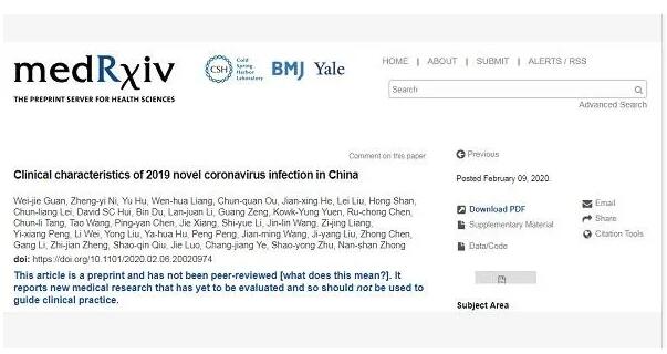 3.Guan W, Ni Z, Hu Y, et al. Clinical characteristics of 2019 novel coronavirus infection in China. medRxiv 2020; posted Feb 9. DOI:10.1101/2020.02.06.20020974.