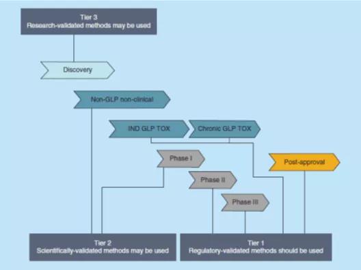 ±ðµÄ£¬µ±PK½«×÷ΪGLP·ÇÁÙ´²»òÁÙ´²Ñо¿µÄÒ»²¿·Ö£¬ÔÚÏ¡ÓеÄÉúÎï»ùÖÊ£¨ÀýÈ磬¾«Òº¡¢ÊàŦǻ»¬Òº¡¢ÓÕµ¼Ìµ¡¢¿ÚÇ»ÄÚÊÃÖ½¡¢×éÖ¯¾ùÖÊ¡¢Ö§Æø¹Ü·ÎÅݹàÏ´[BAL]Òº¡¢ÄòÒºµÈ£©ÖнøÐÐÆÀ¹Àʱ£¬¿ÉÒÔʹÓÿÆÑ§¼¶ÑéÖ¤µÄÆÊÎöÒªÁ죨µÚ2¼¶£¬Tier 2£©£¬ÈçFDAÖ¸Äϲݰ¸ÖÐ˵Ã÷µÄ£¬±¾Ö¸ÄÏ¿ÉÄÜÊÊÓÃÓÚѪҺºÍÄòÒºµÄBA¡¢BEºÍPKÑо¿¡£¹ØÓÚÓÃÓÚÄÚ²¿¾ö²ß£¨ÀýÈç̽Ë÷ÐÔÑо¿¡¢ºòѡҩÎïµÄÑ¡Ôñ¡¢Åä·½±È½Ï»ò¶ÔÒ©Àí»úÖÆµÄÑо¿£©»ò×÷Ϊ·ÇGLP »òÒ©Îï·¢Ã÷Ñо¿ÖÐʹÓÃÁËÏ¡ÓлùÖʵÄPKÆÀ¹À£¬¿ÉÒÔÓ¦ÓÃÑо¿¼¶ÑéÖ¤ÊÂÇéÁ÷£¨µÚ3¼¶£¬Tier 3£©¡£Í¼1¸ÅÊöÁËÔÚÒ©Î↑·¢µÄ¸÷¸ö½×¶Î£¬¿ÉÒÔÓ¦ÓÃÓÚ¸÷¸ö½×¶ÎµÄÏàÓ¦¼¶±ðµÄÒªÁìÑéÖ¤Á÷³Ì¡£